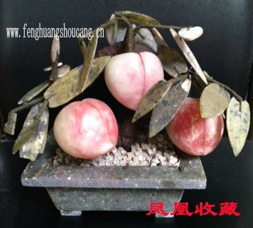 【清朝帝王的艺术审美度-是独步古今的!造就一批能工巧匠!有许多《精美绝伦的玉石珠宝盆景》!通常用各种玉石、玛瑙、翡翠、碧玺、松石等铸就而成!此盆景以【玉石为盆景,青玉为叶,三个玉桃,色泽浑然天成,令人赞叹,蟠桃寿寓,雕工精湛!构思巧妙-巧夺天工!