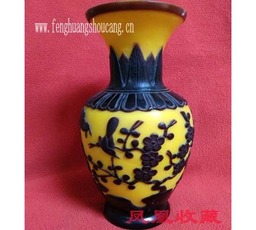 套料琉璃观赏瓶!乾隆年间宫廷造办处琉璃厂御制、稿劳贵赠,皇宫大臣、作友邦来使的国礼。精湛的手工雕碾、显示皇家登峰造极的琉璃料器工艺精品!《喜鹊登梅》黄套料观赏瓶,雕工精湛,皇家专用色彩,体现皇家鉴赏美乐气韵!